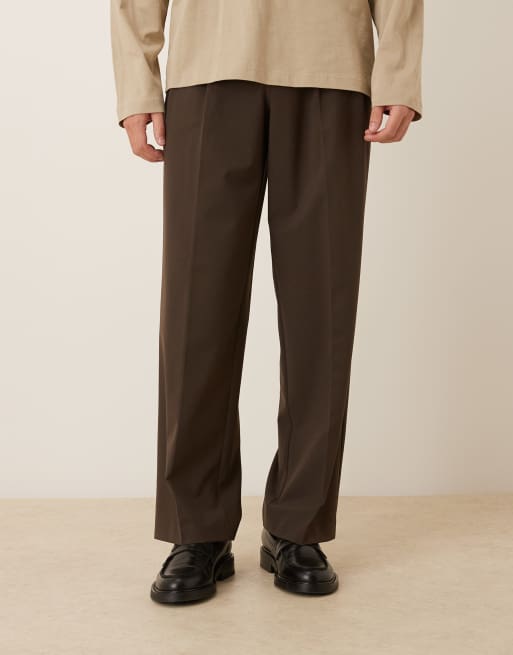 ASOS DESIGN – Elegante Hose in Braun mit sichtbarem Knopfverschluss, weitem Bein und doppelten Bügelfalten