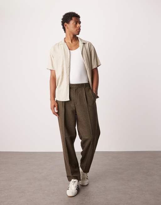 ASOS DESIGN – Elegante, schmal zulaufende Oversize-Hose aus Twill in Braun mit Bundfalten und Wollanteil