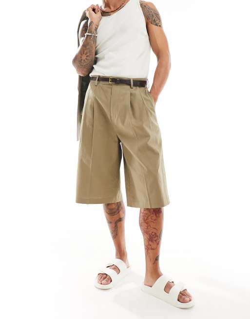 ASOS DESIGN – Elegante Shorts aus Leinenmix in Khaki mit Longline-Schnitt