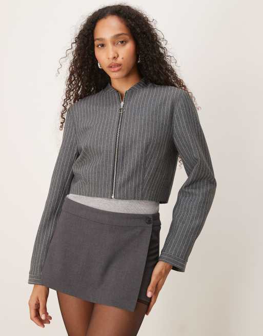 ASOS DESIGN – Eleganter Cropped Blazer in Grau mit Nadelstreifen und Reißverschluss vorne