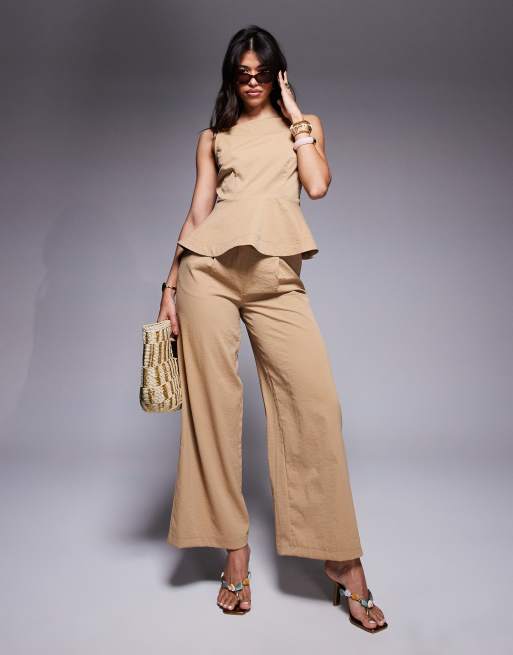 ASOS DESIGN – Elegantes Set in Hellbraun mit Schößchen-Camisole und Hose mit weitem Bein