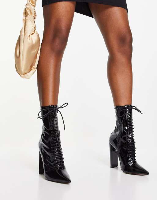 ASOS DESIGN – Ellis – Schnürstiefel in schwarz lackiert mit hohem Absatz