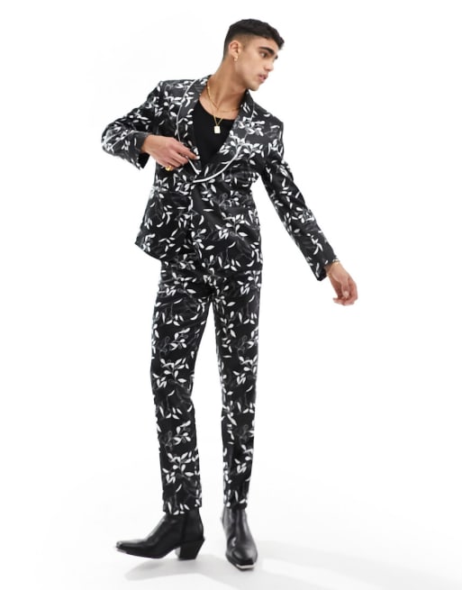 ASOS Design – Eng geschnittener Anzug in Schwarz mit Blumenmuster und weißer Paspelierung