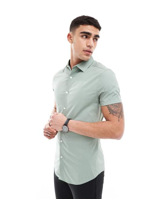 ASOS DESIGN – Enges Hemd in Salbeigrün mit Umschlagsaum an den Ärmeln