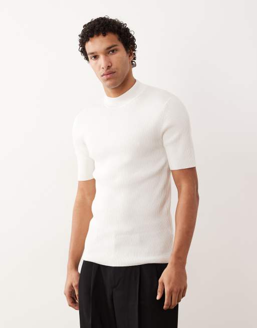ASOS DESIGN – Essential – Fein geripptes Muskelshirt in Wollweiß mit Stehkragen