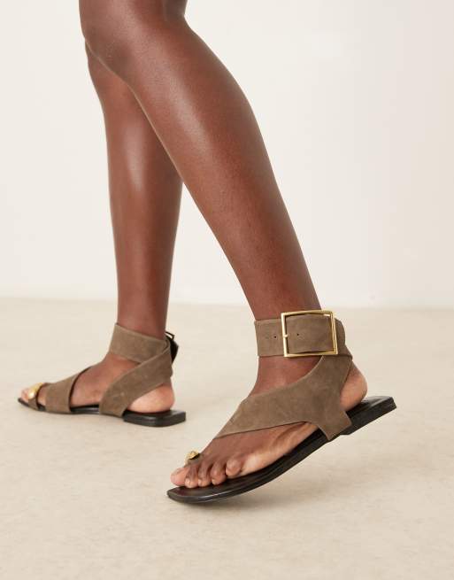 ASOS DESIGN – Fernando – Wildleder-Sandale in Khaki mit Zehenschlaufe aus Metall