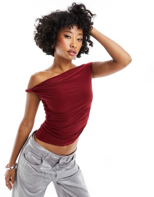 ASOS DESIGN – Figurbetontes, asymmetrisches Oberteil in Burgunderrot mit abfallendem, verdrehtem Träger
