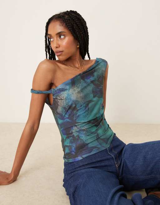 ASOS DESIGN – Figurbetontes, schulterfreies Oberteil mit blauem Blumenmuster und verdrehtem Detail, Kombiteil