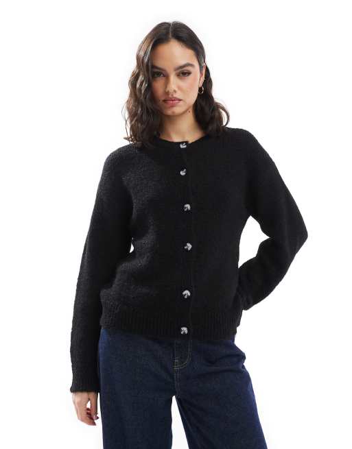 ASOS DESIGN – Flauschige Wollmix-Strickjacke in Schwarz mit Rundhalsausschnitt