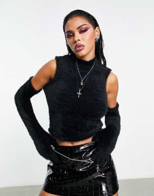 ASOS DESIGN – Flauschiger Pullover in Schwarz mit Handschuh-Ärmeln