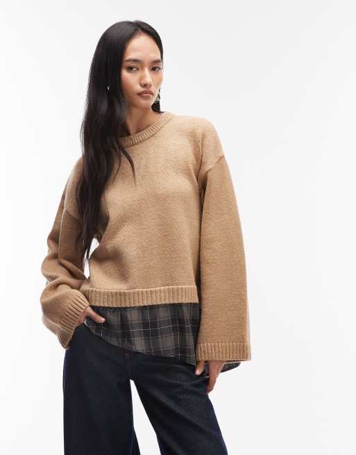 ASOS DESIGN – Flauschiger Strickpullover in Braun mit weiten Ärmeln und kariertem Saum