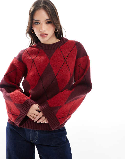 ASOS DESIGN – Flauschiger Strickpullover mit Rautenmuster in Rot und Burgunderrot