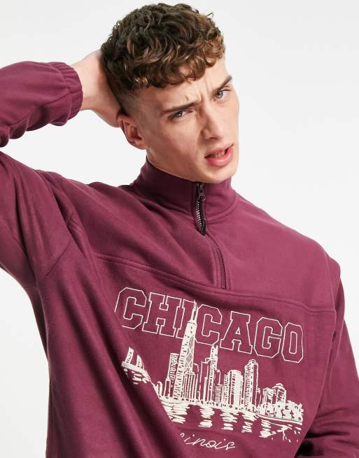 ASOS DESIGN – Fleece-Sweatshirt mit Oversize-Schnitt, kurzem Reißverschluss und „Chicago“-Stickerei auf der Brust