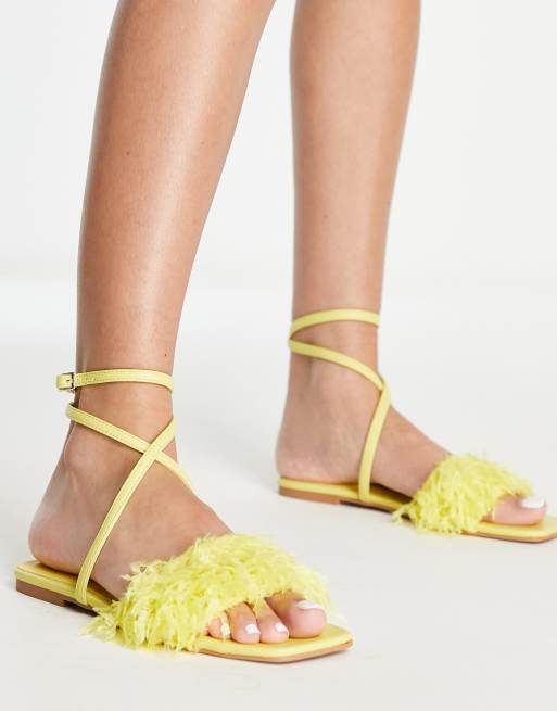 ASOS DESIGN – Four – Flache Sandalen in Gelb mit Kunstfederbesatz