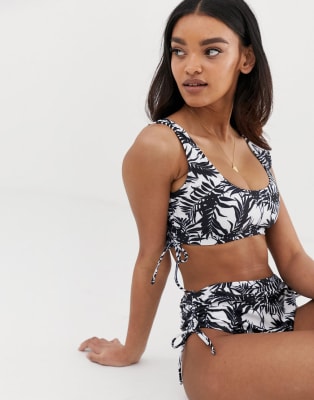 ASOS DESIGN – Fuller Bust – Exklusives, seitlich gerafftes Bikinioberteil mit schwarz-weißem Palmenmuster