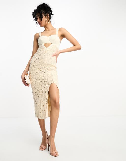ASOS DESIGN – Gehäkeltes Midi-Trägerkleid in Steinbeige mit Körbchen