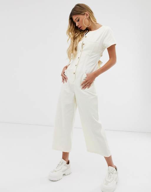 ASOS DESIGN – Geknöpfter Jeans-Jumpsuit mit Rückenausschnitt in Ecru