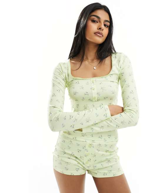 ASOS DESIGN – Gemütliches Thermo-Oberteil in Zitronengelb mit Blümchenmuster, Kombiteil
