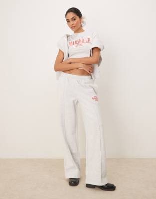 ASOS DESIGN – Gerade geschnittene Jogginghose in meliertem Eisgrau mit besticktem „Marseille“-Print