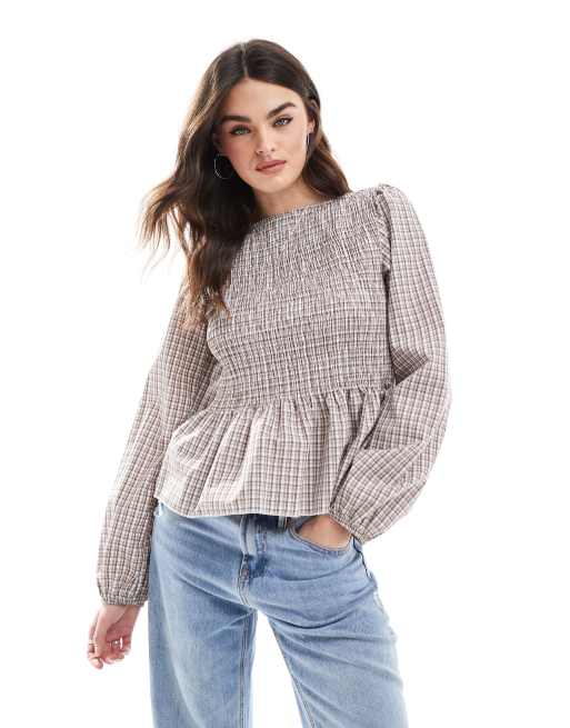 ASOS DESIGN – Geraffte Bluse mit Karomuster und Schößchendetail