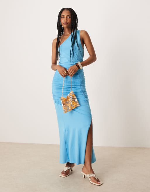 ASOS DESIGN – Gerafftes Maxikleid in Blau mit One-Shoulder-Träger und Ziernaht
