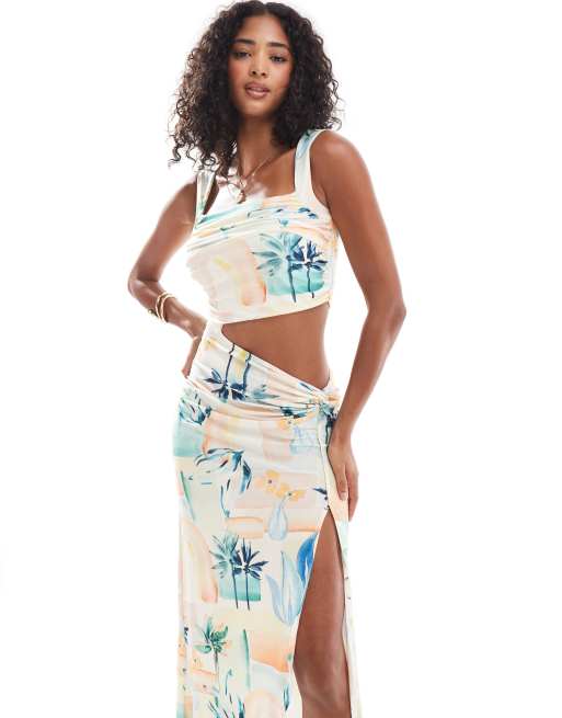 ASOS DESIGN – Gerafftes Midikleid mit Zierknoten und Palmenmuster