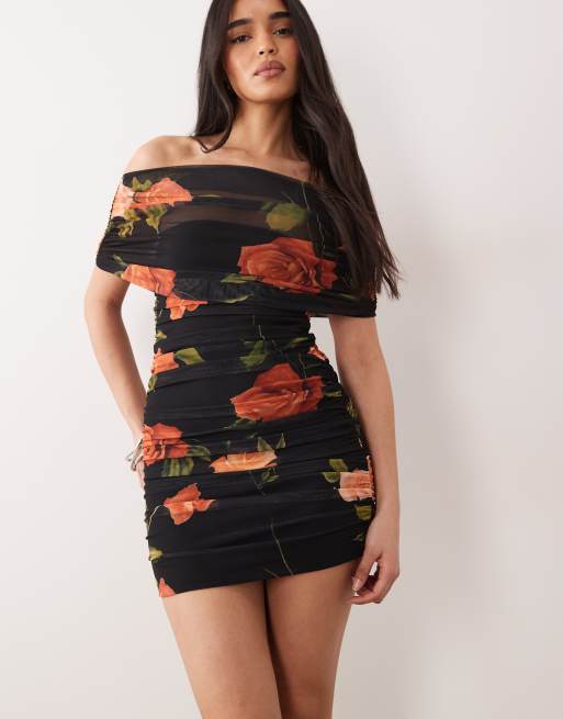 ASOS DESIGN – Gerafftes Minikleid aus Netzstoff mit drapierter Schulter und Muster