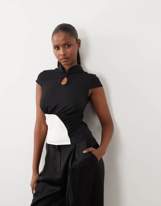 ASOS DESIGN – Gerafftes Polyamid-Oberteil in Schokobraun mit Kappärmeln und Stehkragen