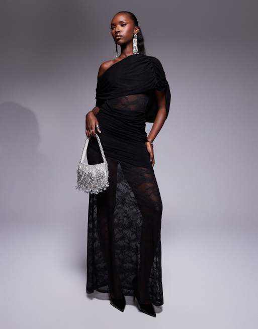ASOS DESIGN – Gerafftes, schulterfreies Maxikleid in Schwarz mit Spitzeneinsätzen