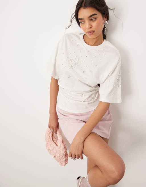 ASOS DESIGN – Gerafftes T-Shirt in Weiß mit Perlenverzierung