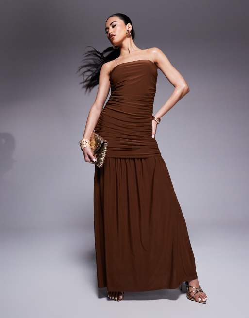ASOS DESIGN – Gerafftes, trägerloses Maxikleid in Schokobraun mit tiefer Taille