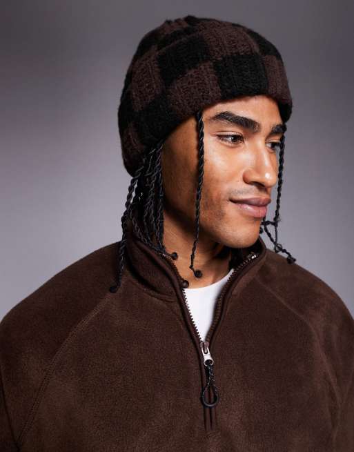 ASOS DESIGN – Gerippte Strickmütze in Braun und Schwarz mit Schachbrettmuster