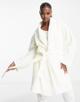 ASOS DESIGN – Gerippter Bademantel aus Kunstpelz mit Knitterstruktur in Creme
