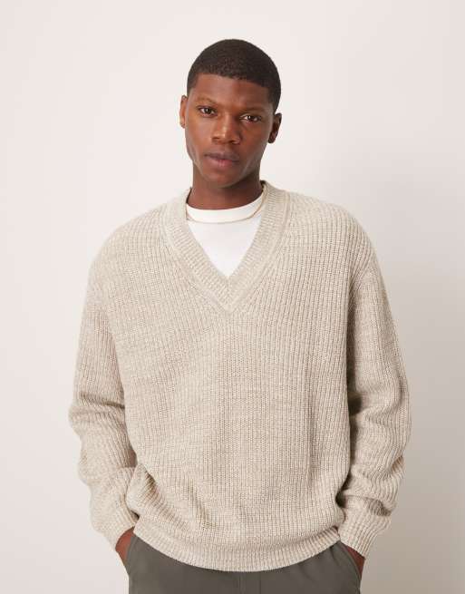 ASOS DESIGN – Gerippter Oversize-Seemannspullover in Beige meliert mit V-Ausschnitt
