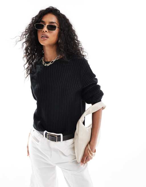 ASOS DESIGN – Gerippter Pullover in Schwarz mit Rundhalsausschnitt
