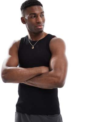 ASOS DESIGN – Geripptes Basic-Muskelshirt in Schwarz mit Rundhalsausschnitt