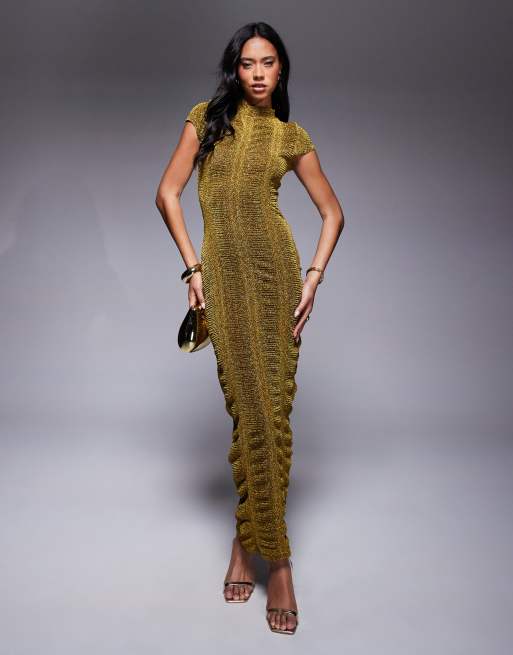 ASOS DESIGN – Geripptes Bodycon-Midikleid in Glitzer-Gold mit Kappärmeln
