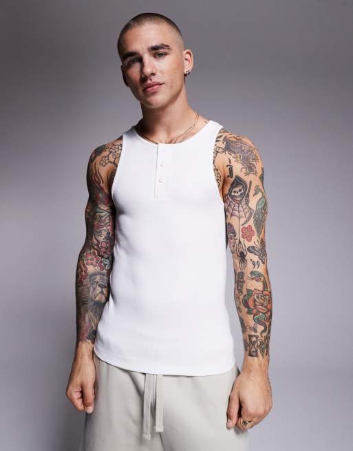 ASOS DESIGN – Geripptes Henley-Muskelshirt in Weiß