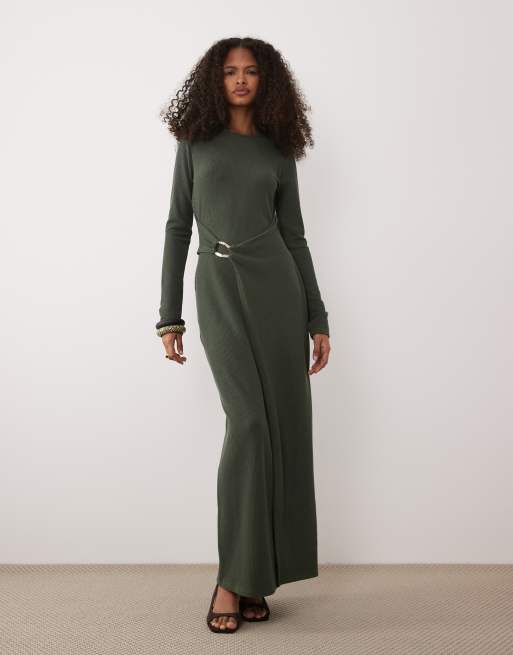 ASOS DESIGN – Geripptes Midikleid in Khaki mit goldfarbenen Metalldetails
