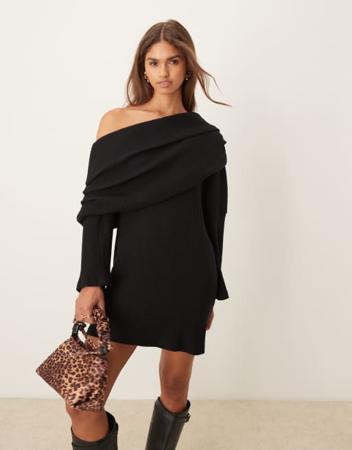 ASOS DESIGN – Geripptes Minikleid in Schwarz mit abfallender Schulterpartie
