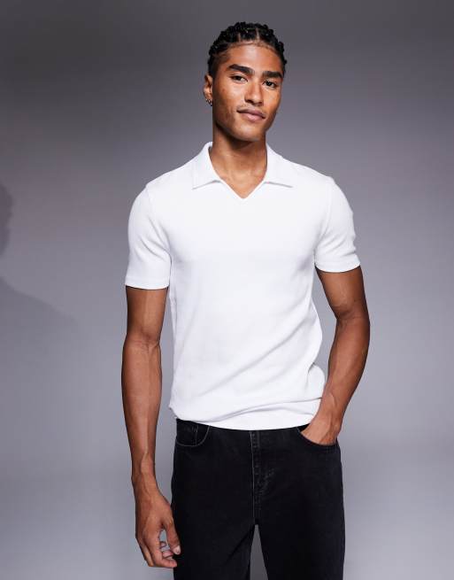 ASOS DESIGN – Geripptes Muskel-Polohemd in Weiß