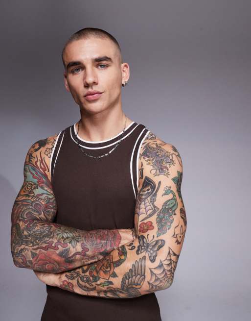 ASOS DESIGN – Geripptes Muskelshirt in Braun mit farblich abgesetzter Einfassung