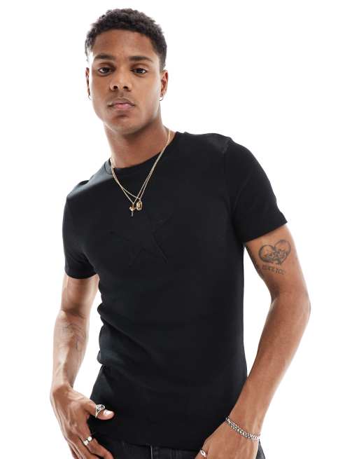 ASOS DESIGN – Geripptes Muskelshirt in Schwarz mit Applikation