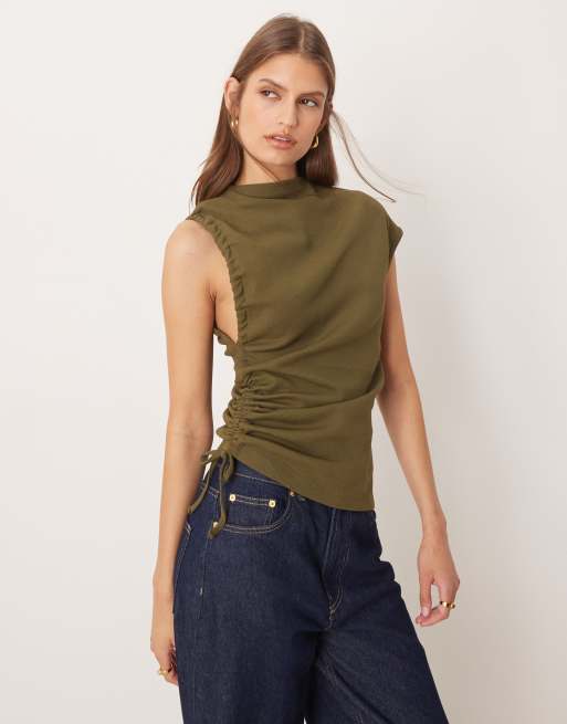 ASOS DESIGN – Geripptes Oberteil in Khaki mit geraffter Seite und Stehkragen