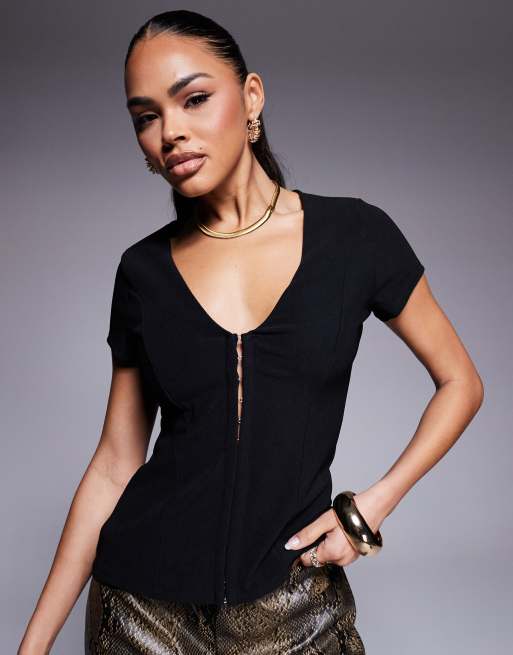 ASOS DESIGN – Geripptes, strukturiertes Oberteil in Schwarz mit kurzen Ärmeln und tiefem Ausschnitt