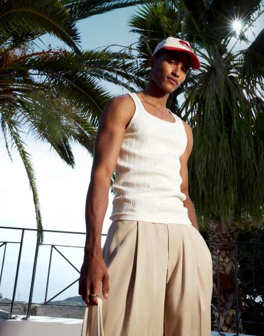 ASOS DESIGN – Geripptes T-Shirt in Creme mit Muskelschnitt und hohem, eckigem Ausschnitt