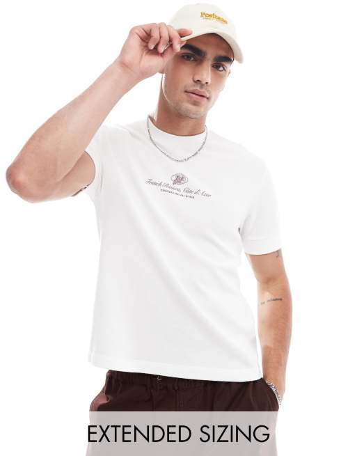 ASOS DESIGN – Geripptes T-Shirt in gebrochenem Weiß mit Textprint auf der Brust