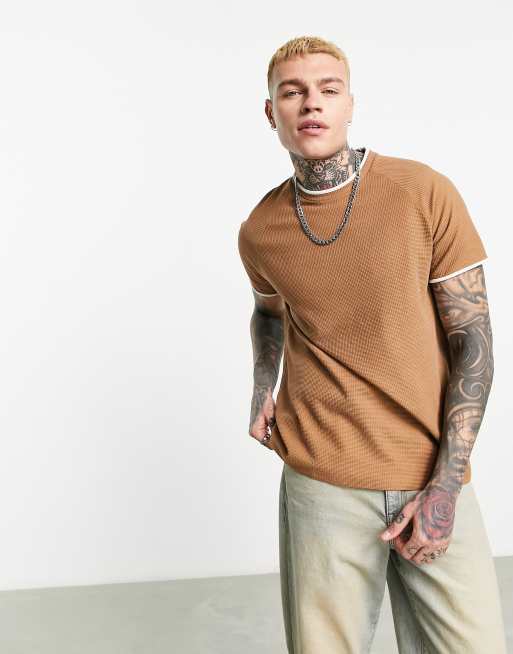 ASOS DESIGN – Geripptes T-Shirt in Hellbraun mit lockerem Schnitt und farblich abgesetztem Ausschnitt