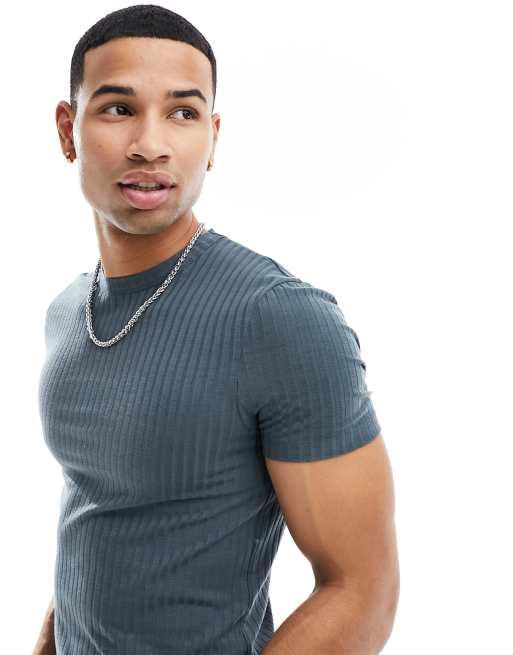 ASOS DESIGN – Geripptes T-Shirt mit körperbetontem Schnitt in Anthrazit