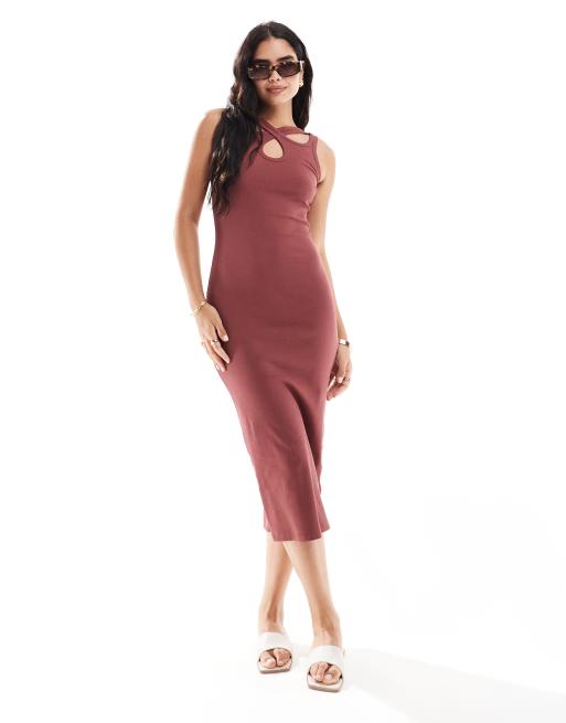 ASOS DESIGN – Geripptes Tanktop-Midikleid in Ochsenblutrot mit überkreuzten Ausschnitt-Trägern